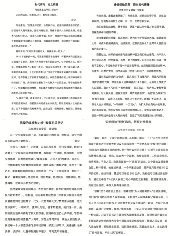 经由公司专业老师评审,17级思想政治教育班裴琼倩的《信仰的温度与力度--致敬习近平总书记》获一等奖,19级思想政治教育班郑心宁的《时代所向,志之所趋》、沙惟奕的《感悟领袖风范,担当时代责任》获二等奖,17级思想政治教育班江红英的《守望初心,无悔青春》、沈舒敏的《弘扬领袖“无我“风范,抒写时代答卷》、谢伟欣的《学习基本理论,感悟领袖风范》获三等奖。