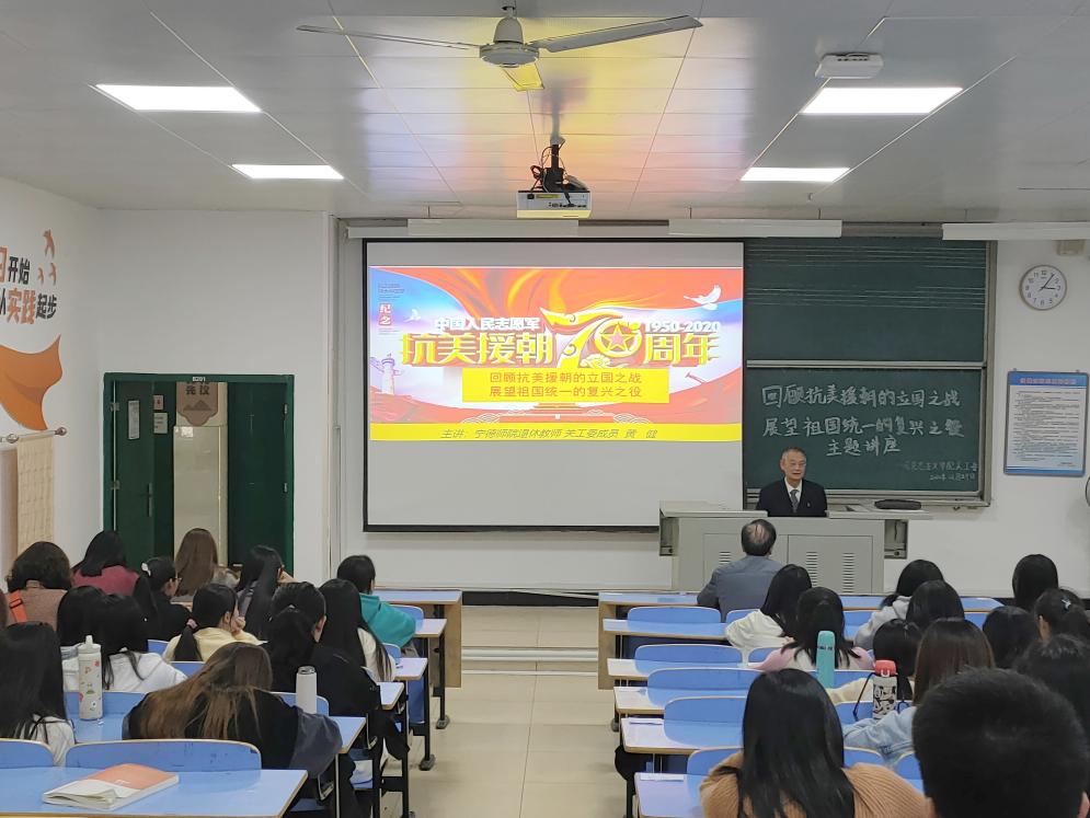 黄健副教授以“回顾抗美援朝艰苦卓绝的浴血奋战、感受抗美援朝立国之战的伟大意义、展望祖国统一复兴之役的光明前景”三个主要方面为切入点,通过军事史专家徐焰少将讲述历史和一系列战役视频、志愿军英雄榜展示等多种形式,带领师生们一起重温了领袖人物、民族英雄、革命先烈的经典故事。同学们深深感受到了中国共产党领导中国人民披荆斩棘、不畏牺牲、争取民族独立的艰辛与伟大,深刻领会了全国各族人民万众一心、同舟共济的爱国情怀。随后黄健副教授引用毛主席曾提出的抗美援朝的五大意义和习近平总书记在纪念抗美援朝70周年大会上的发言,加以解释伟大抗美援朝胜利的原因及意义,带领同学们进一步了解了伟大的抗美援朝精神,坚定了同学们传承和发扬抗美援朝精神的决心。从多方面、多角度地阐述展望祖国统一复兴的前景。黄健副教授深刻论述了两岸关系、中央战略部署以及如何实现统一复兴等等问题,将抗美援朝精神和当代政治问题高度结合,加深了同学们对世界格局、中国格局的认识,给同学们带来深刻的启示。