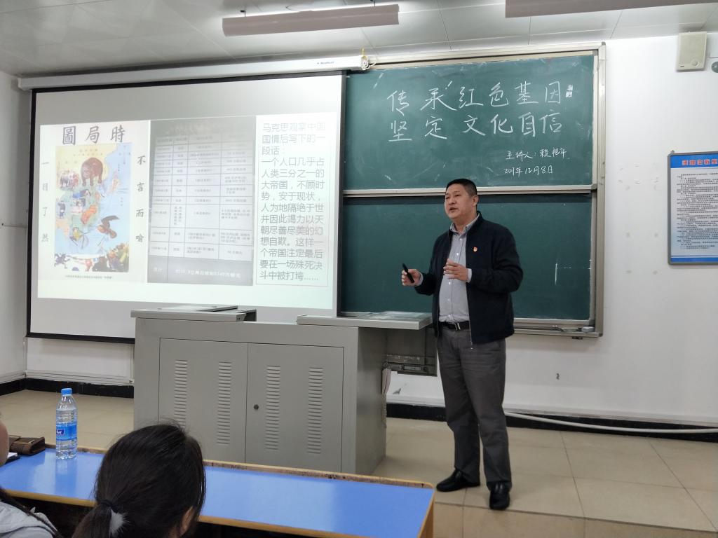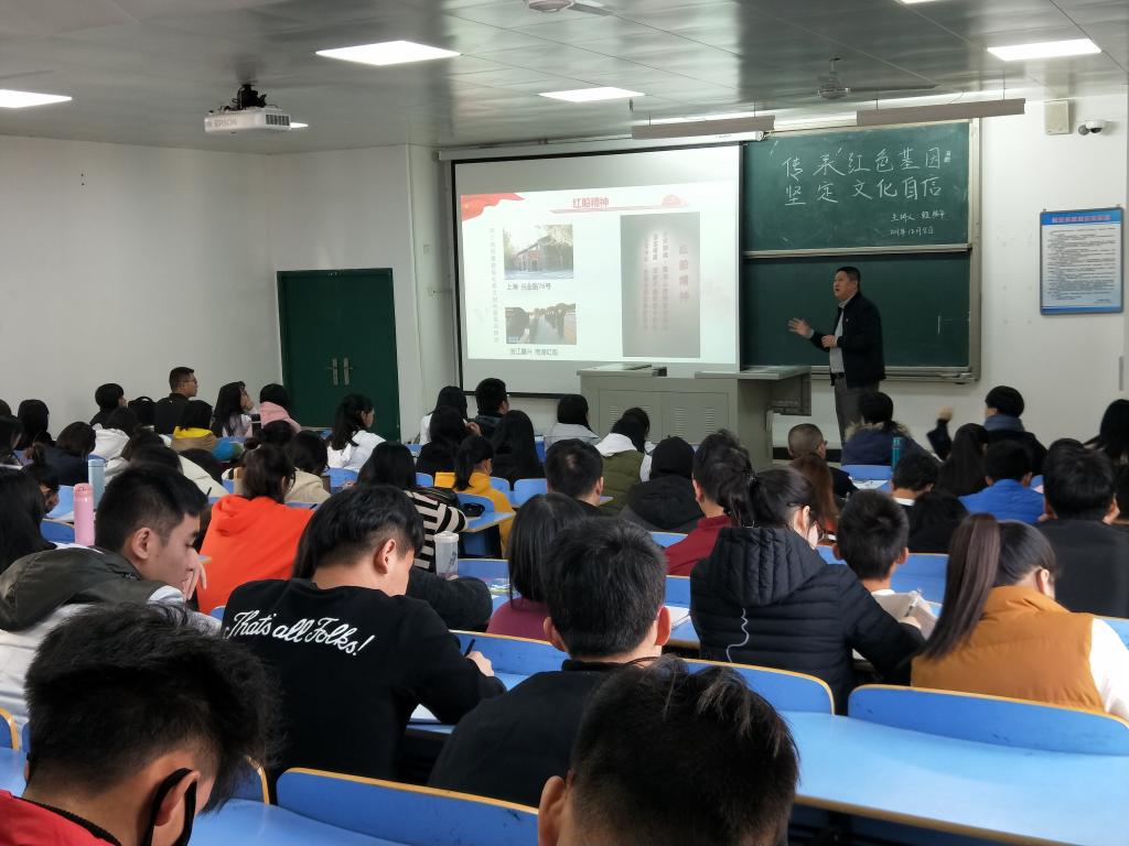 赖艳华副教授从革命文化内涵中向同学们讲到了建国前党的精神:红船精神、井冈山精神、苏区精神、长征精神、抗战精神、延安精神以及西柏坡精神。让同学们更加深入了解党的坚定信念、艰苦奋斗、勇创新路的精神。他还从文化自信方面向同学们提出期盼,要坚定道路自信、理论自信、制度自信,文化自信。他强调,文化自信是更基础、更广泛、更深刻的自信,文化自信是更基本、更深沉、更持久的力量。