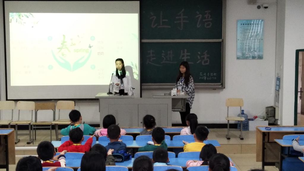 活动采取现场教学形式,表演部部长温梅灵、副部长刘小英通过现场教学使小朋友们掌握基本的手语用语并让小朋友们了解了手语在生活中的用处。此次教学首先进行家庭生活中基本称谓的教学,再利用所学到的简单词语进行造句,比如“爸爸妈妈我爱你们”之类的。随后让小朋友们反复练习并鼓励小朋友们上台表演所学知识。为了提高小朋友们对手语的学习兴趣,社团成员们还准备了歌曲《感恩的心》的手语教学,并请全体小朋友和老师们一起进行课堂互动,合作完成歌曲的完整手语表演。活动历时一个小时,30余名小朋友们从简单的模仿到能够表达基本的词汇信息,这是一次心、手合一的手语公益教学!
