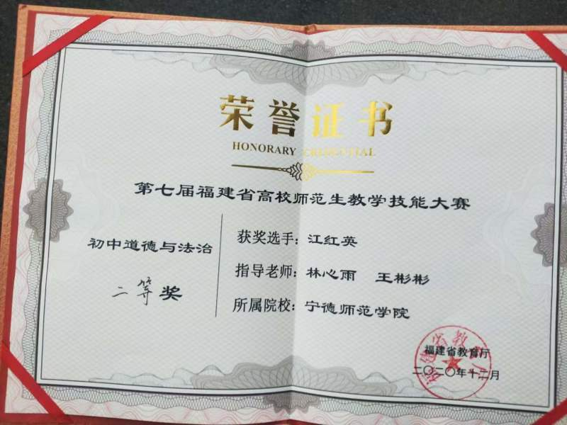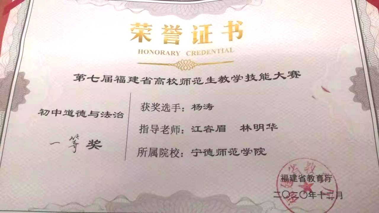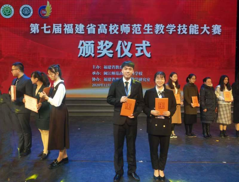 为贯彻落实《中共中央国务院关于全面深化新时代教师队伍建设改革的意见》和全国全省高校毕业生就业创业工作视频会议精神,进一步提高我省高校师范专业毕业生教学技能水平和就业竞争力,近日,由福建省教育厅主办的“福建省第七届高校师范生教学技能大赛”在闽江师范高等专科公司落下帷幕。公司的杨涛、江红英两位同学积极备赛,并在江容眉、林心雨、林明华、王彬彬四位优秀老师的指导下,杨涛同学斩获初中道德与法治组一等奖,江红英同学斩获初中道德与法治组二等奖。