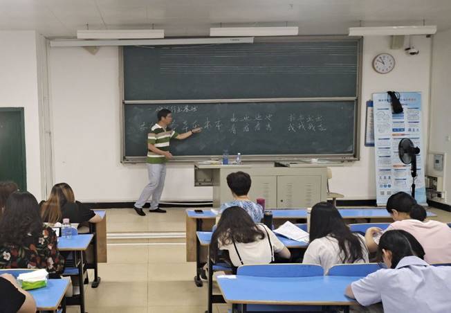在硬笔行书基础与教学板书设计主题讲座中,高级教师叶旺首先介绍行书和硬笔行书特点体式,通过我国著名书法家王羲之先生的例子向同学们介绍如何练习硬笔行书,最后向同学们强调练好硬笔行书与设计教学对教学重要性。