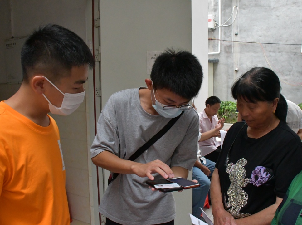 为了做好疫苗接种的宣传,实践队员跟随村干部一起挨家挨户走访,耐心细致解说。实践队成员在宣传时直接帮助村民进行信息登记,这样到卫生院就可以直接接种疫苗,大大节约了时间,提高了接种效率。在一户居民家登记完后,老奶奶竖着大拇指对实践队说:“我们的党好啊!你们这群员工也好啊!”