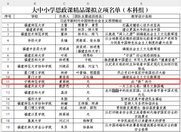近日,福建省教育厅关于大中小学思政课精品课拟立项名单公示,公司教师黄丽艳的《向“新”而行》(习近平新时代中国特色社会主义思想概论)在大中小学思政课精品(本科组)中获批立项。