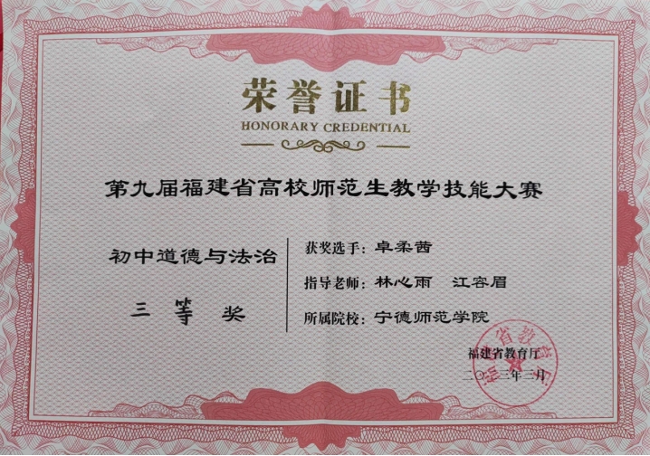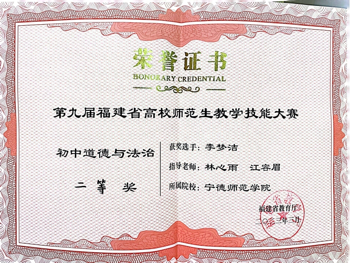3月17日至3月19日,第九届福建省高校师范生教学技能大赛在闽南师范大学举行。本届比赛由福建省教育厅主办,闽南师范大学承办,福建省普通教育研究室协办,全省32所院校的251名选手参赛。公司派出19级同学李梦洁和卓柔茜参加初中道德与法治组比赛,经过激烈比拼,李梦洁、卓柔茜分别获得二等奖、三等奖的好成绩。