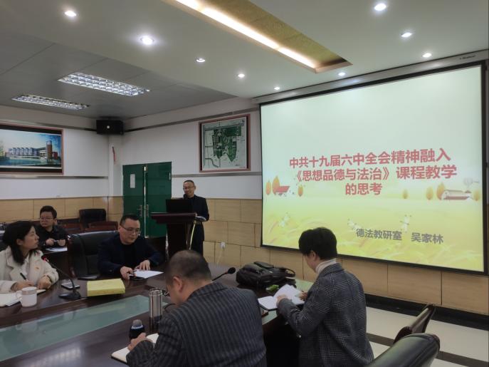 吴家林教授代表思想道德与法治教研室就全会精神融入思想道德与法治课程教学进行了专题解读,引导教师要关注整体课程体系,选择重点章节进行融入,并重点就第二章第二节的理想信念专题、第六章法治专题如何融入全会精神进行了解析。