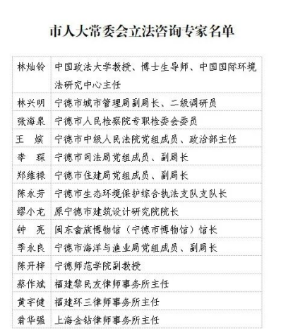 为在地方立法中推进全过程人民民主,推动科学立法、民主立法、依法立法,发挥专家学者在地方立法工作中的智力支持作用,日前宁德市人大常委会经主任会议研究决定聘请公司陈开梓副教授等14位同志为新一届宁德市人大常委会立法咨询专家,聘期五年。