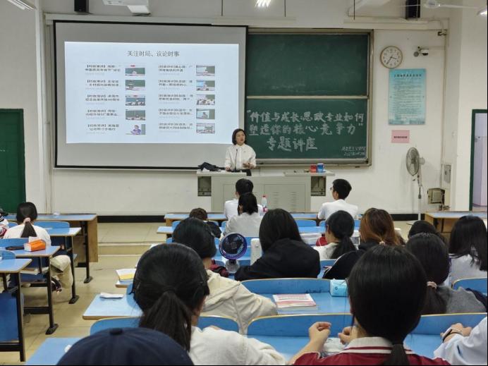 王彬彬老师从“如何塑造核心竞争力”展开,围绕读、写、讲三个核心竞争力要素,充分运用视频结合自身丰富经验,分享了她成长经历路程。在“读”方面,她告诫同学们读书的重要性,教诲同学们不仅要读有字之书,更要读无字之书,拓宽对社会的认知。在“写”上,她指出写作的重要性,鼓励同学们养成写作的习惯,并对如何写作给出了详细的建议。在“讲”的层面,她引导同学们用心观察生活,将日常的生活画面巧妙的变成课堂的话题导入,引导同学们通过跨学科交融来设计课堂,努力提高员工的积极性。在老师全面的讲解下,同学们对自己未来职业规划有了进一步的认知,不仅明确了职业路径,更坚定了用思政力量服务教育事业、传递理想信念的初心。