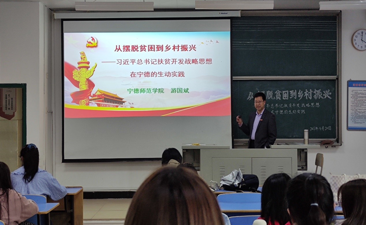 讲座伊始,游国斌教授介绍了习近平总书记从陕西梁家河知青插队到中央治国理政的经历,尤其是习近平总书记指导福建工作长达17年,促进福建的全面发展。讲座中,游国斌教授围绕“宁德,习近平总书记工作过的地方”、“宁德,习近平总书记扶贫开发战略思想的重要萌发地和实践地”、“宁德,三十年滴水穿石见证历史性巨变”三个部分展开,向读书社成员介绍了宁德从摆脱贫困到乡村振兴的30多年历程,闽东大地是如何发生历史性巨变的,“宁德模式”为什么会成为“中国特色扶贫开发道路的一个典范?”引发读书社成员对宁德三十多年沧桑巨变的思考。讲座结尾,游国斌教授总结道,宁德的脱贫攻坚已经取得了全面胜利,闽东人民将在习近平新时代中国特色社会主义思想的指导下,弘扬老区精神,传承革命基因,奋力谱写新时代宁德发展新篇章,开创高质量发展超越新未来。