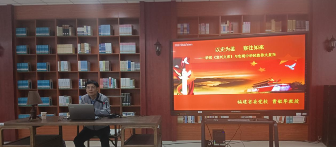 开幕式结束后,“青马工程”教师骨干班及老员工骨干班、读书社学员聆听曹敏华教授开设的《复兴文库》专题讲座。本次讲座,曹教授从大型历史文献丛书《复兴文库》的编纂出版、从思想史角度认识《复兴文库》的学术价值和研读《复兴文库》坚定不移走民族复兴正道三个方面为学员们详细分析了《复兴文库》的学术价值以及时代意义,着重讲述了收录在《复兴文库》中关于福建省的五篇文献和中国抗日战争时期的思想政治道路。曹教授的讲座主题鲜明、深入浅出、逻辑清晰,既有理论高度又有现实指导作用,让我们对《复兴文库》这部大型历史文献丛书有了更深刻的认识和进一步的了解。之后,在曹教授的带领下,大家自选文章,认真研读了《复兴文库》,从中汲取历史智慧,更加坚定道路自信,在中华民族伟大复兴的征程中不断奋进。